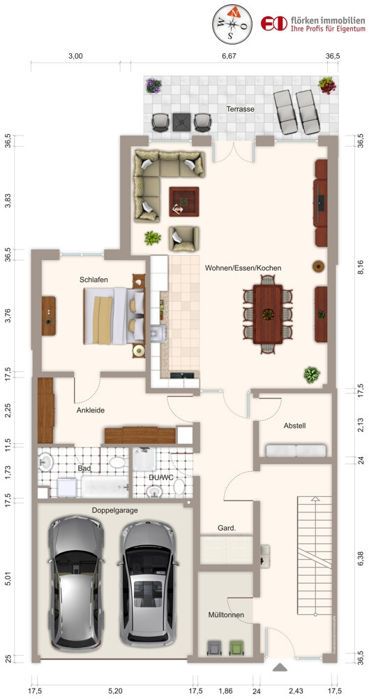 KEINE ZUSÄTZLICHE KÄUFERPROVISION! Alle Angaben sind nach besten Wissen und Gewissen gemacht. Irrtum und Zwischenverkauf vorbehalten. Die Flörken Immobilien GmbH haftet nicht für Irrtümer oder Schriftfehler. Sämtliche Informationen dieses Exposés basieren auf Informationen und Unterlagen, die uns durch den Eigentümer oder Dritten überlassen wurden und nach besten Wissen und Gewissen durch uns geprüft wurden. Im Vorfeld der konkreten Erwerbsüberlegung erhalten Sie sämtliche zu Grunde gelegten Unterlagen. Wir empfehlen die ausführliche Prüfung. Die in den Grundrissen eingezeichneten Möbel stellen lediglich ein Möblierungsbeispiel dar und sind nicht Teil dieses Angebotes, sofern nicht im Text "Ausstattung" ausdrücklich darauf hingewiesen wird. Die verwendeten Fotos sind in einem Referenzobjekt des Bauherren entstanden und haben Beispielcharakter, sie sind nicht verbindlich. Ebenso geben die digitalen Visualisierungen der Gebäudefront und -rückseite, die einen Ausblick auf ein noch zu erstellendes Bauwerk geben, Belichtungsverhältnisse, farbliche Gestaltungen und Einrichtungen ausschließlich die Sicht des Visualisierers wieder. Es handelt sich nicht um reale sondern digitale Ansichten, diese sind daher ebenfalls nicht verbindlich.